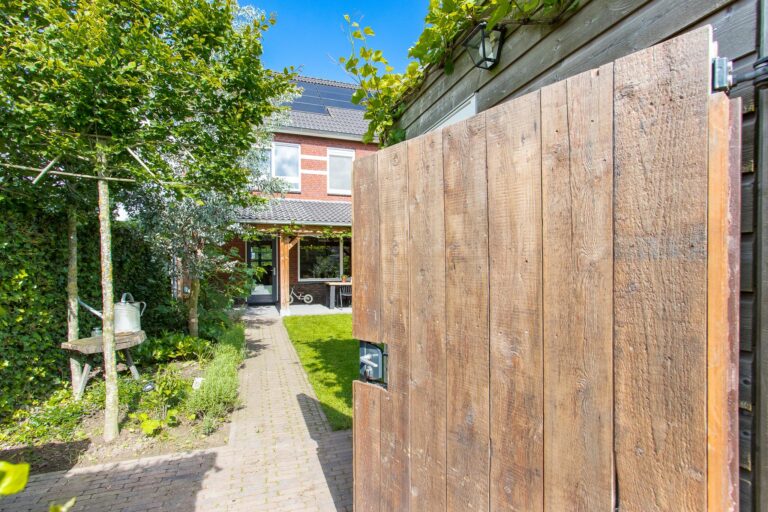 De entree van de woning is bereikbaar via een voetpad met fraai uitzicht over het plantsoen. Aan de achterzijde is er voldoende parkeergelegenheid en biedt de afsluitbare poortdeur toegang tot de achtertuin. De achtertuin is gelegen op het zuidoosten en is aangelegd met o.a. moderne terrastegels, gazon, plantenborders en is voorzien van een houten berging.