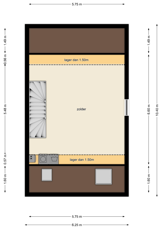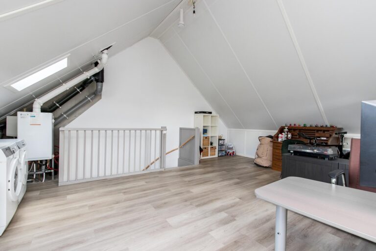 Tweede verdieping: via een vaste trap is de open zolderruimte bereikbaar. Deze ruimte is voorzien van 2 dakvensters en biedt de mogelijkheid om een extra (grote) slaapkamer te realiseren. Hier bevindt zich de C.V.-installatie, witgoedaansluiting, ventilatie-unit en de omvormer van de zonnepanelen.