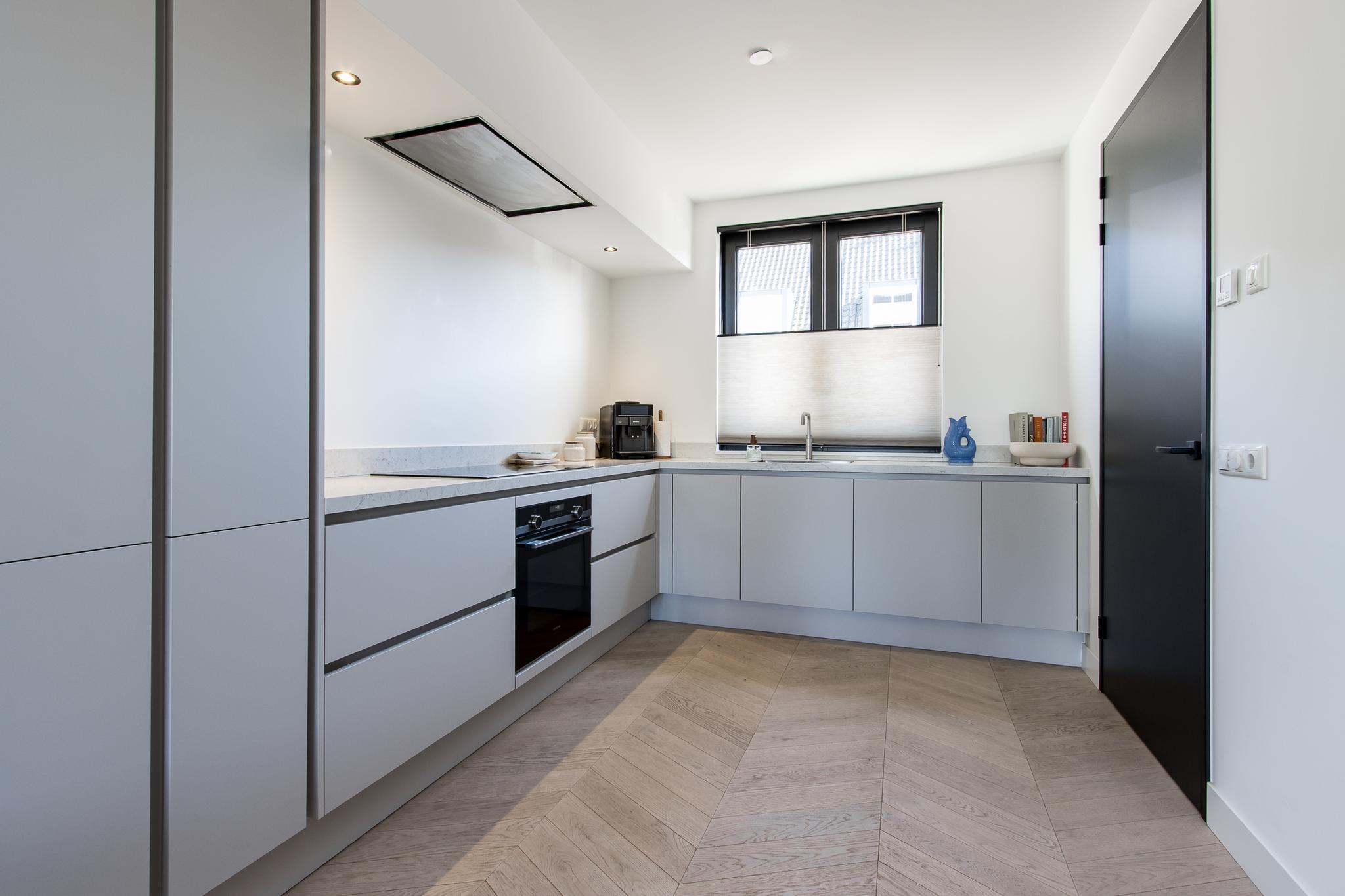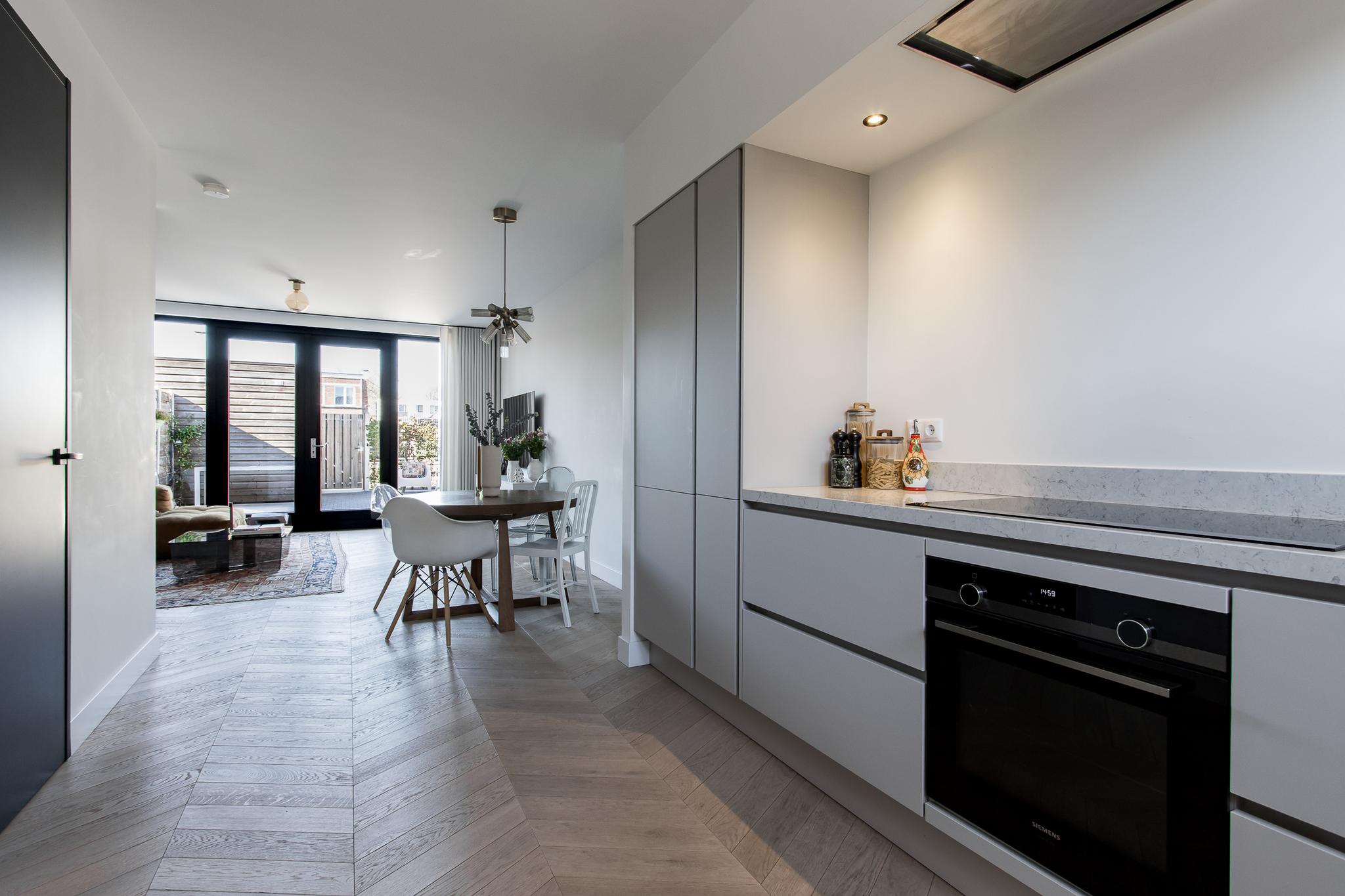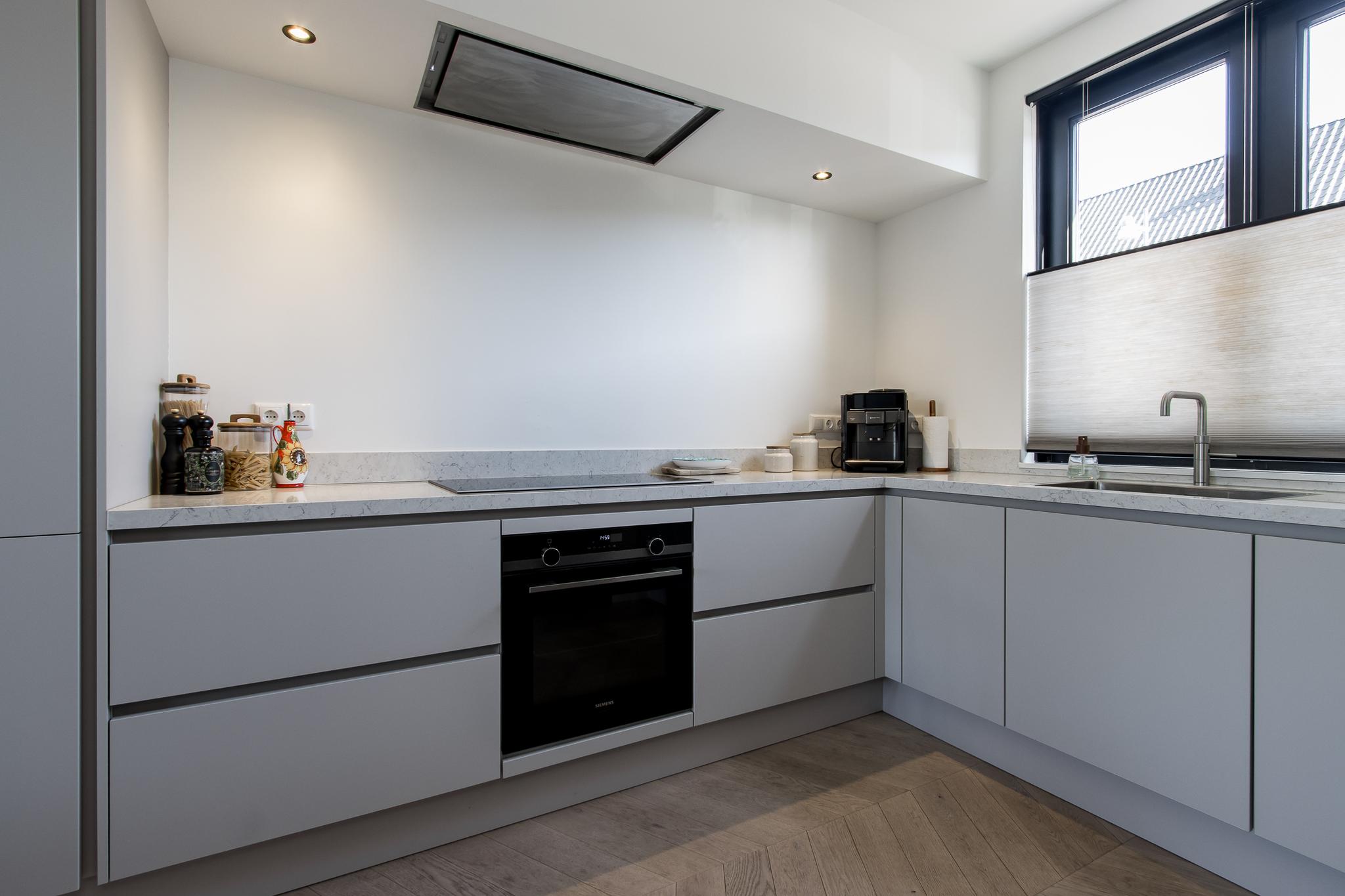 Indeling van de woning: de entree biedt toegang tot de hal met garderobe, meterkast en toiletruimte. Vanuit de hal stap je de moderne keuken binnen, die in open verbinding staat met de tuingerichte woonkamer. Deze lichte en ruime living is voorzien van een praktische trapkast met installatieruimte en openslaande deuren naar het terras. De keuken is uitgerust met een hoekopstelling en diverse inbouwapparatuur van Siemens, waaronder een inductiekookplaat, afzuigkap, combi-oven, vaatwasser, koelkast met vriezer en Quooker.