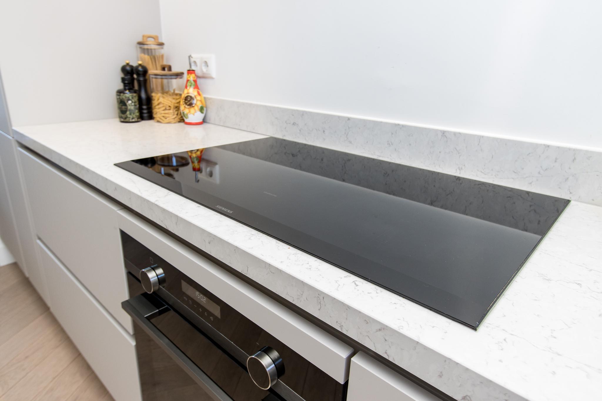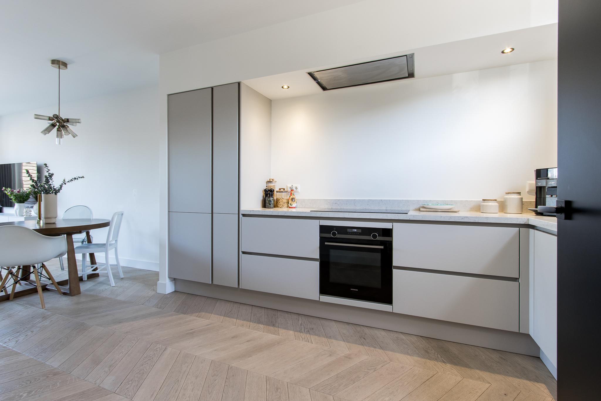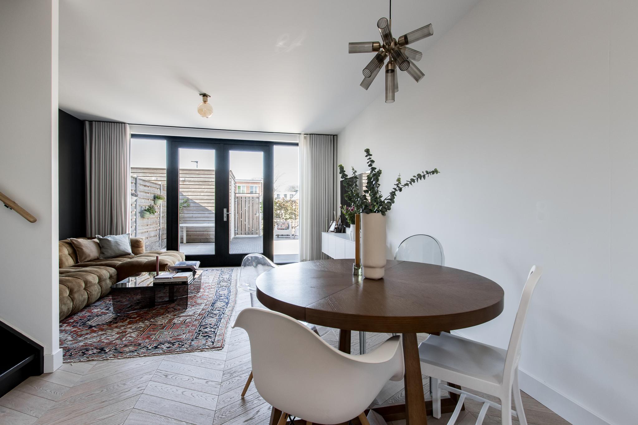 Indeling van de woning: de entree biedt toegang tot de hal met garderobe, meterkast en toiletruimte. Vanuit de hal stap je de moderne keuken binnen, die in open verbinding staat met de tuingerichte woonkamer. Deze lichte en ruime living is voorzien van een praktische trapkast met installatieruimte en openslaande deuren naar het terras. De keuken is uitgerust met een hoekopstelling en diverse inbouwapparatuur van Siemens, waaronder een inductiekookplaat, afzuigkap, combi-oven, vaatwasser, koelkast met vriezer en Quooker.