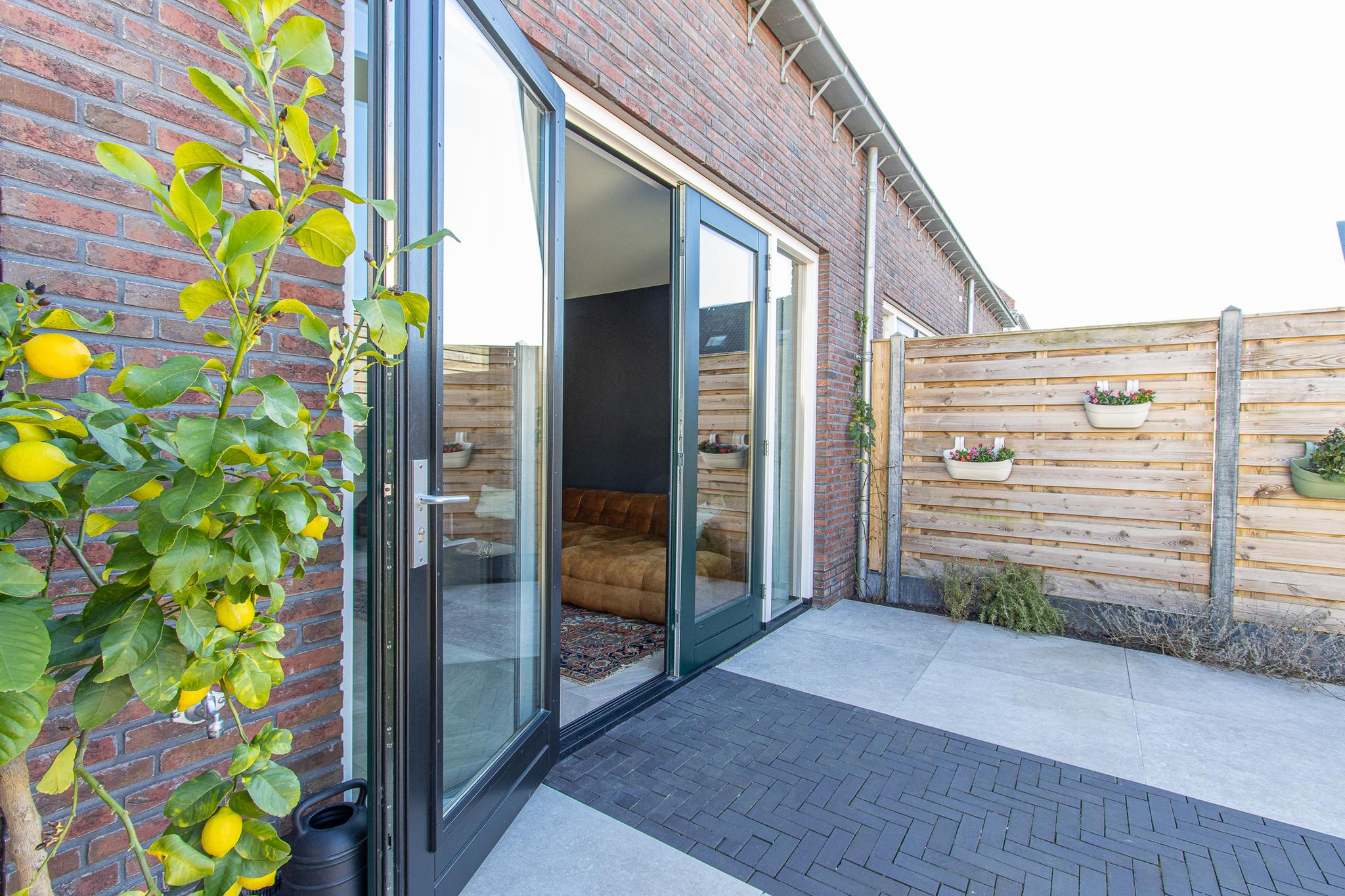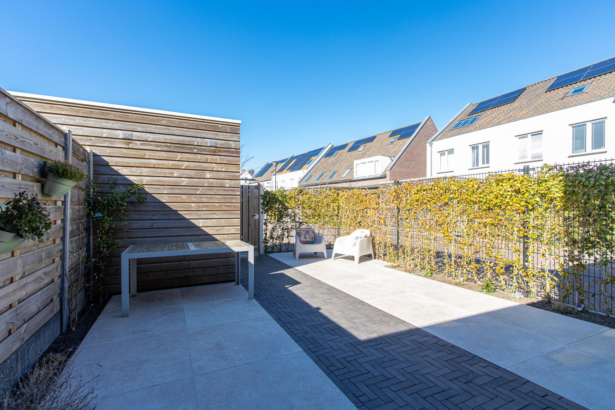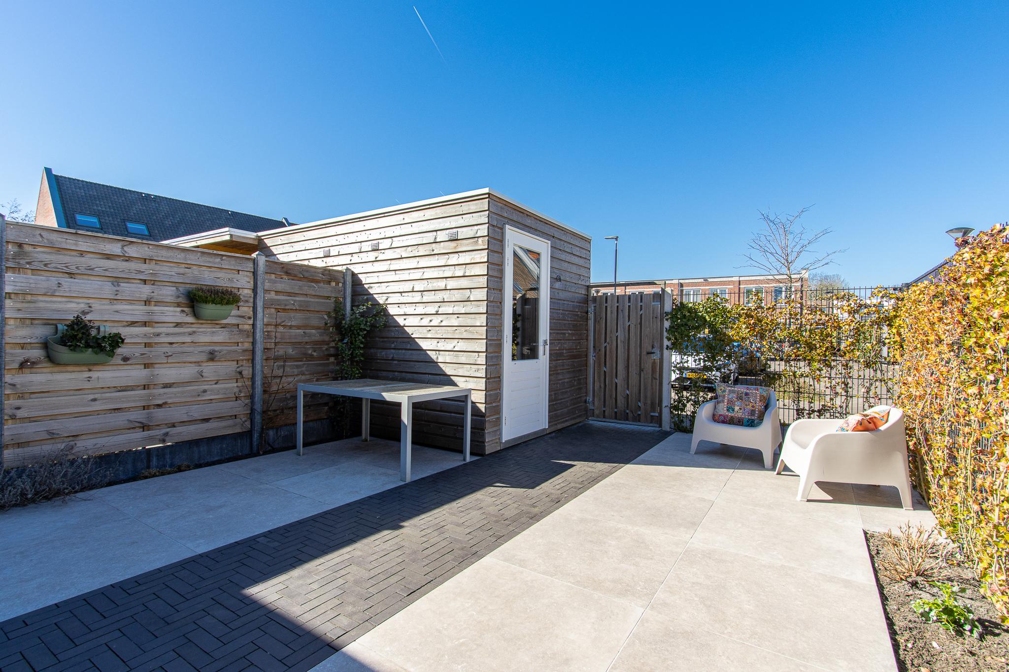 Buiten wacht een heerlijke tuin op het noordwesten, perfect voor de middag- en avondzon. De tuin is strak en sfeervol aangelegd met moderne terrastegels en gebakken klinkers. Een houten schutting zorgt voor beschutting, terwijl de weelderige hedera extra groen en privacy biedt. Via de praktische achterom kom je direct uit op een ruime parkeerplaats.