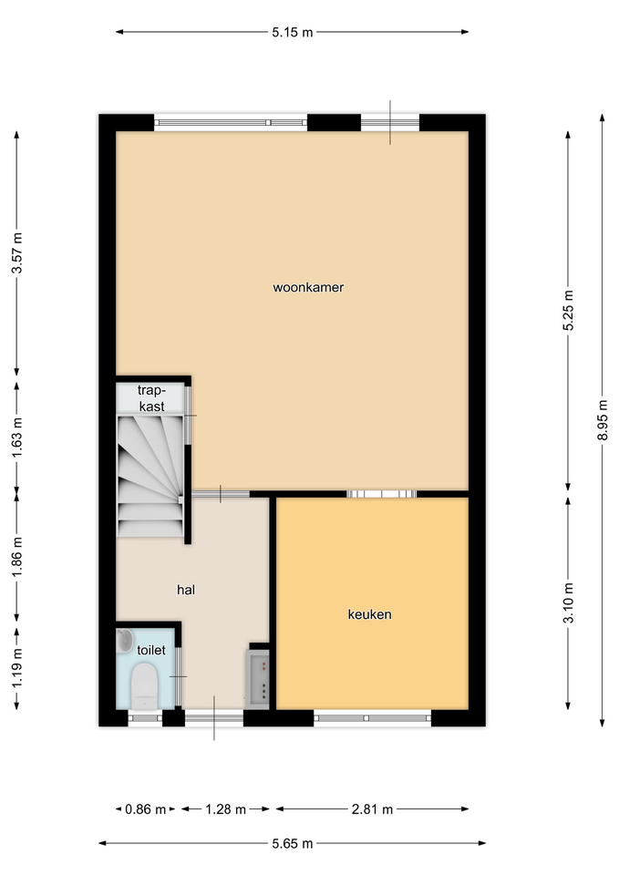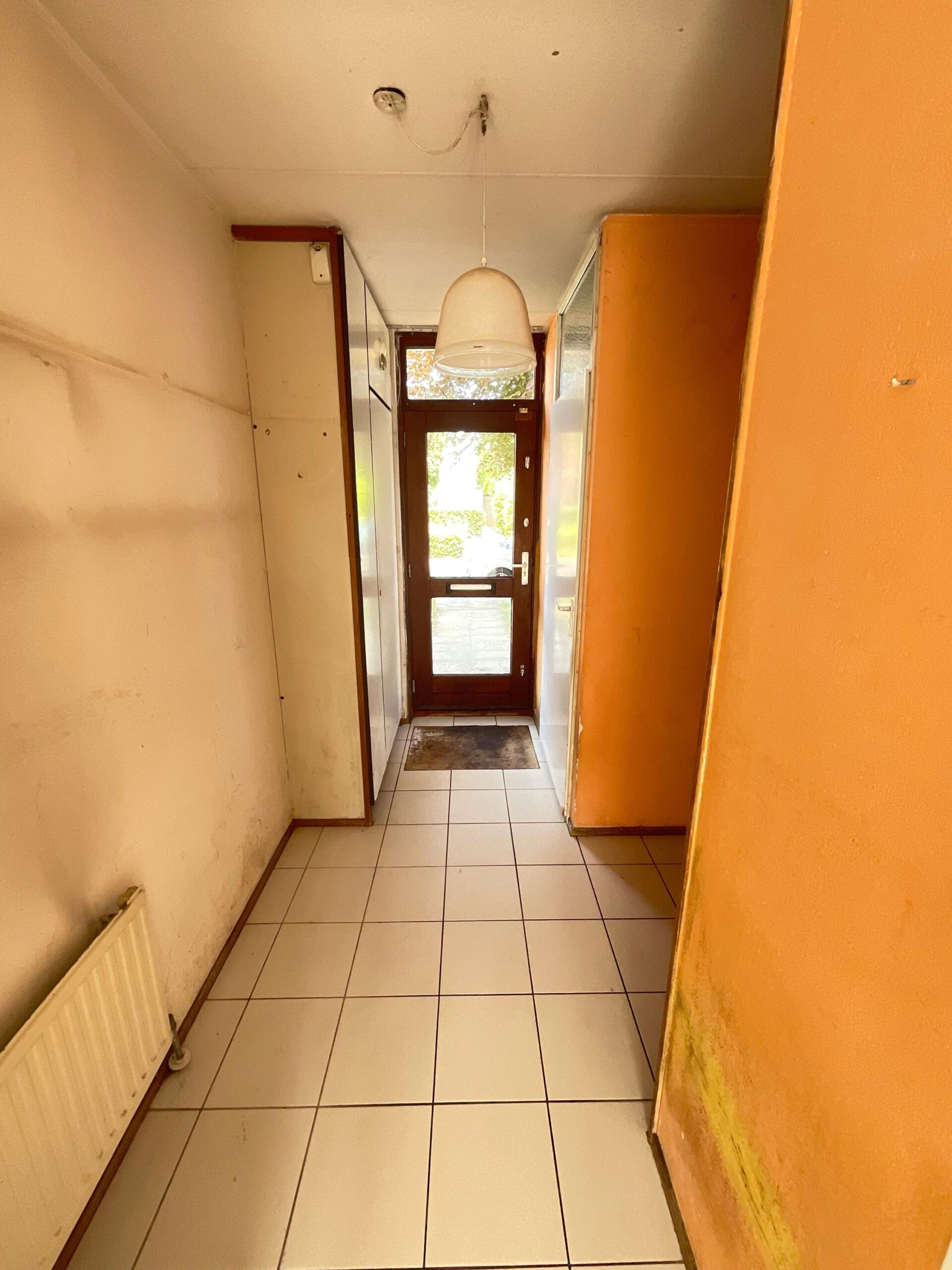 Indeling woonhuis: de entree geeft toegang tot de hal met meterkast, toiletruimte en trapopgang naar de eerste verdieping. Vanuit de hal stapt u de lichte, tuingerichte woonkamer binnen. Via een loopdeur bereikt u de achtertuin.