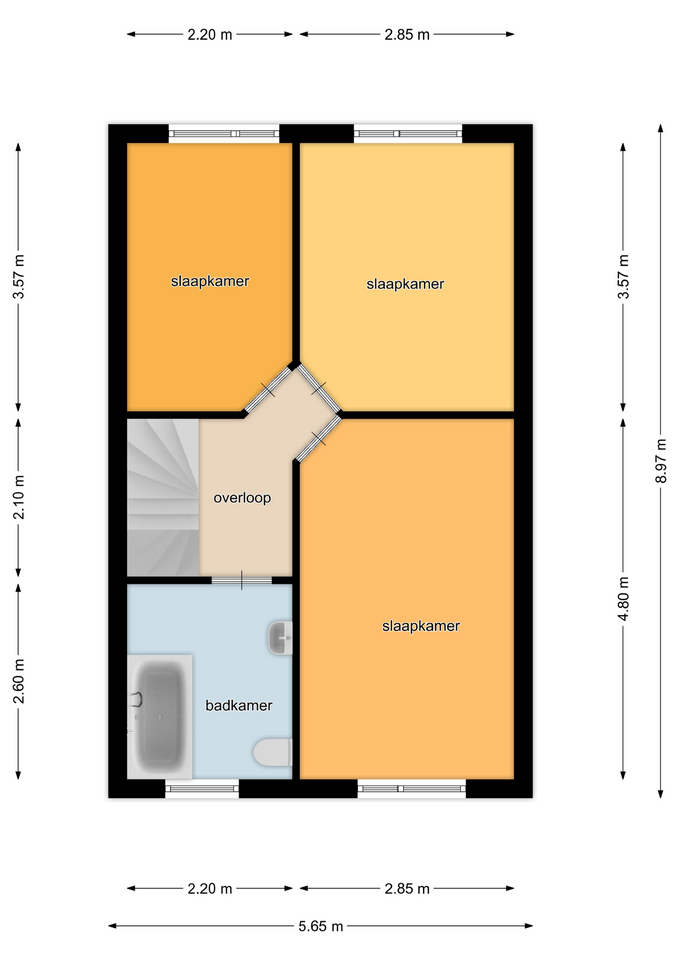 Eerste verdieping: de overloop geeft toegang tot 3 slaapkamers en badkamer.