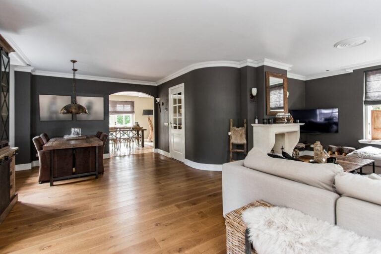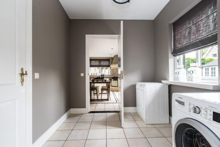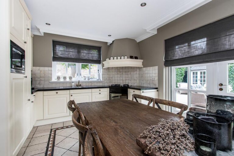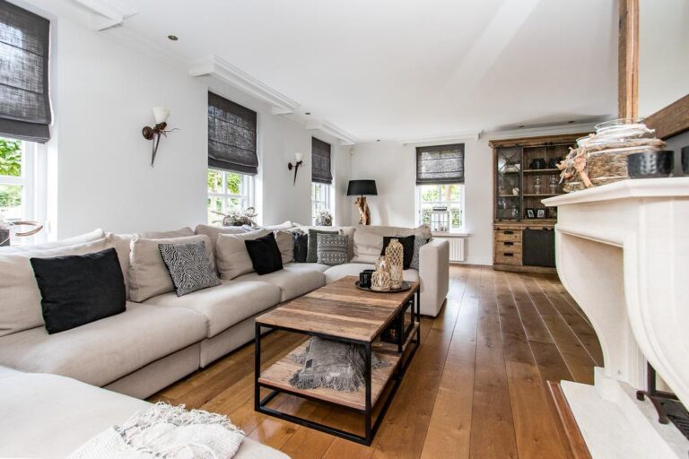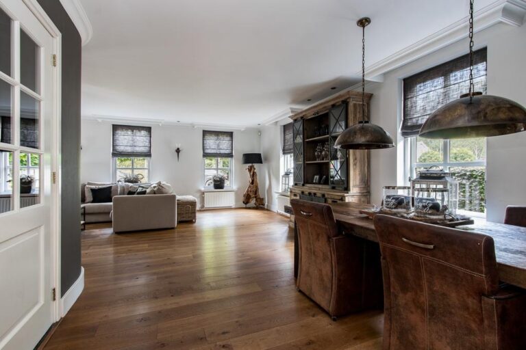 Begane grond: via de riante oprit is de entree met ruime ontvangsthal te bereiken. Hier bevindt zich de uitgebreide meterkast, toiletruimte, trapopgang naar de verdieping en toegang tot de woonkamer. De royale living van ca. 45 m² is voorzien van sfeervolle gashaard en heeft een halfopen verbinding met de woonkeuken v.v. landelijke keukenunit in U-opstelling uitgerust met diverse inbouwapparatuur, zoals; 4-pits gasfornuis, vaatwasser, afzuigkap, koelkast, magnetron en oven. Aansluitend bevindt zich de praktische bijkeuken met vaste kast, witgoedaansluiting en toegang tot de garage en achtertuin.