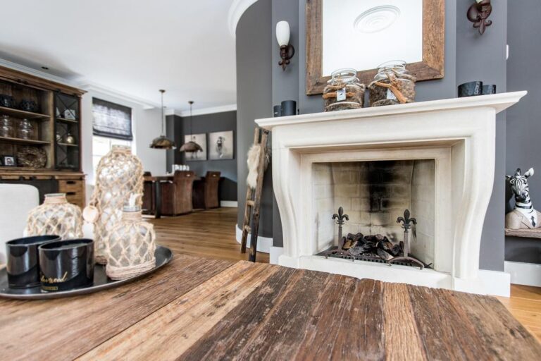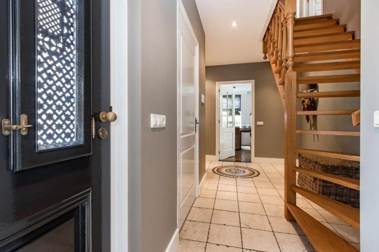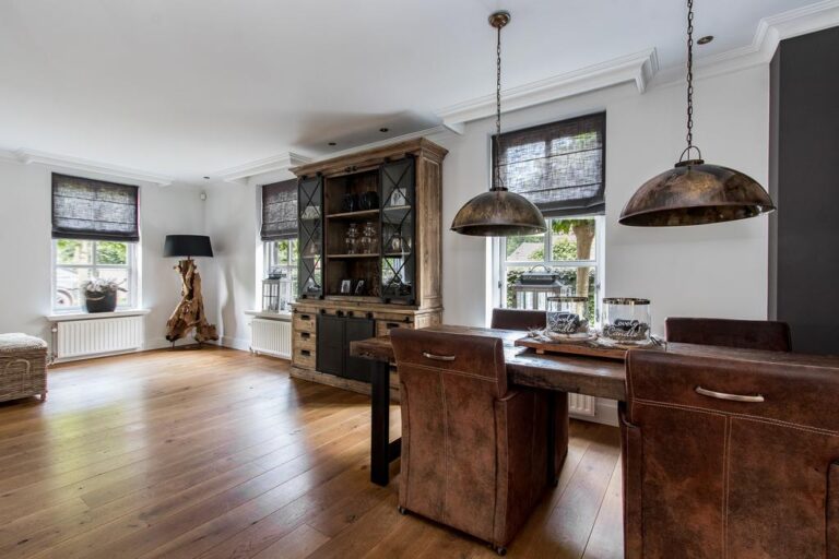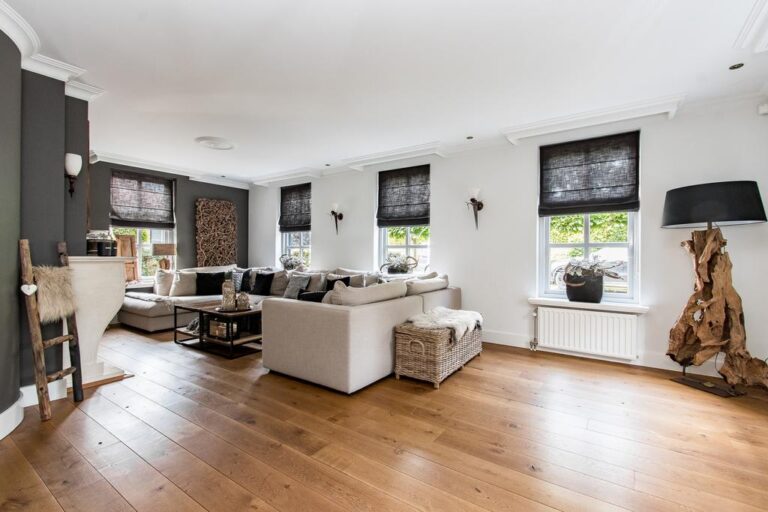– in de woonkamer ligt een massieve eikenhoutenvloer, de overige vloer op de begane grond is voorzien van getrommeld marmer;