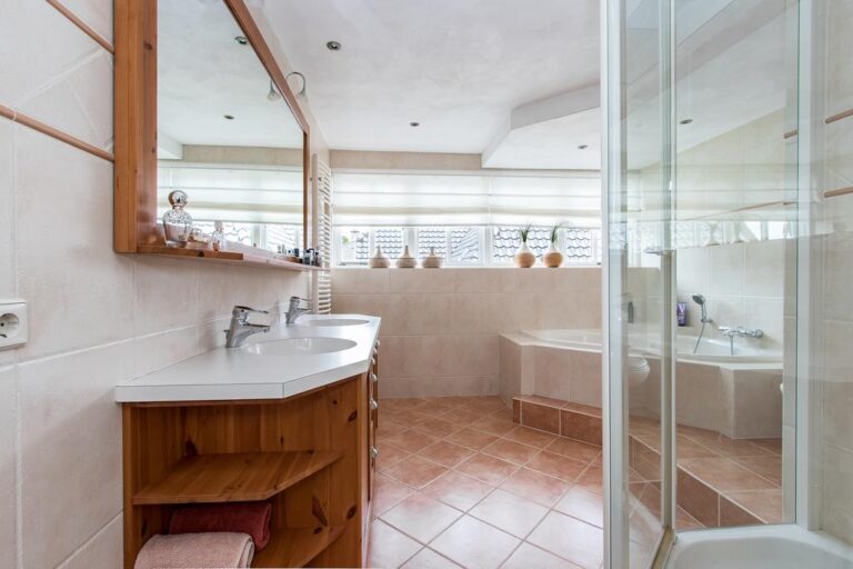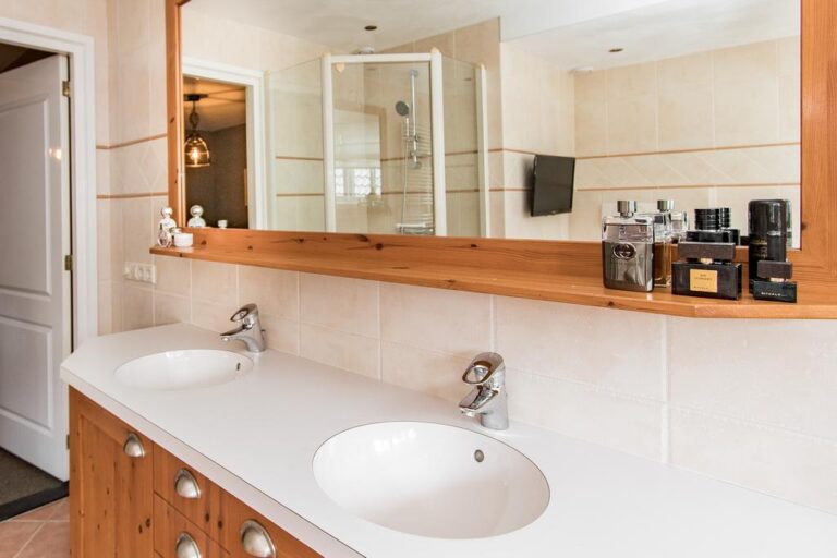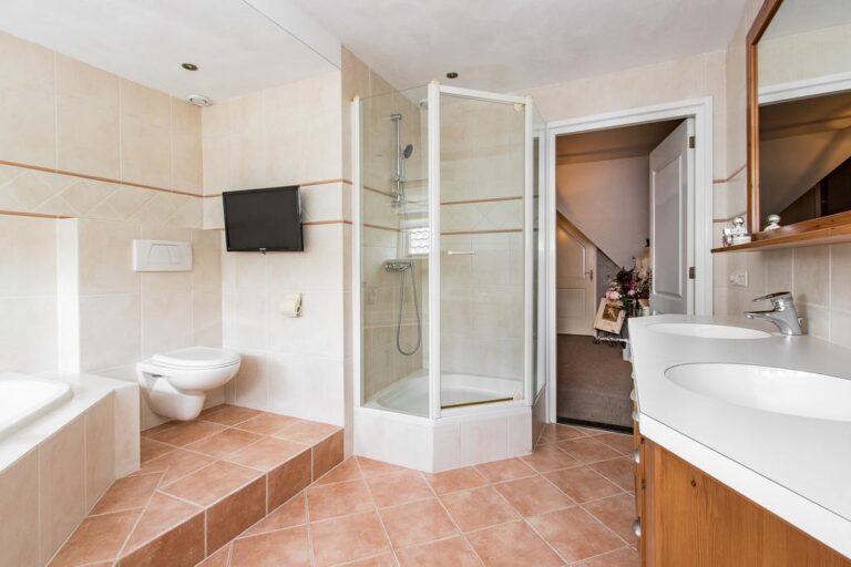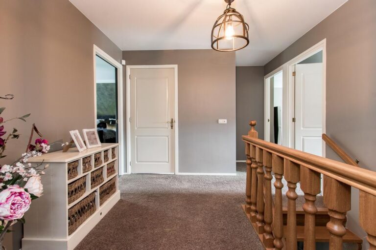 Verdieping: de overloop geeft toegang tot 3 royale slaapkamers en de luxueuze badkamer v.v. ligbad met whirlpool, douche, wandcloset en wastafelmeubel met dubbele wasbak. Via de overloop is de ruimte boven de garage toegankelijk.