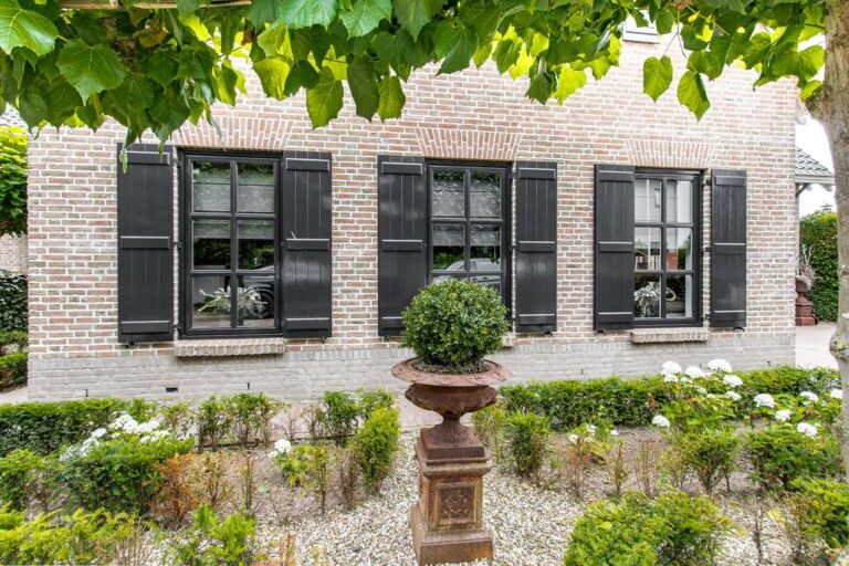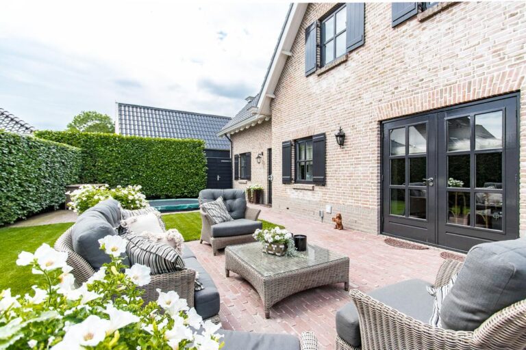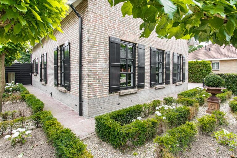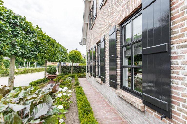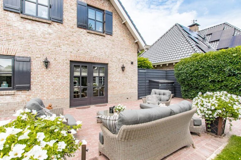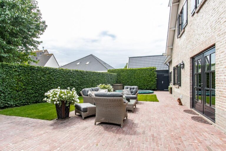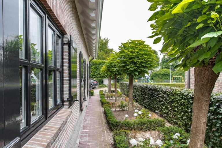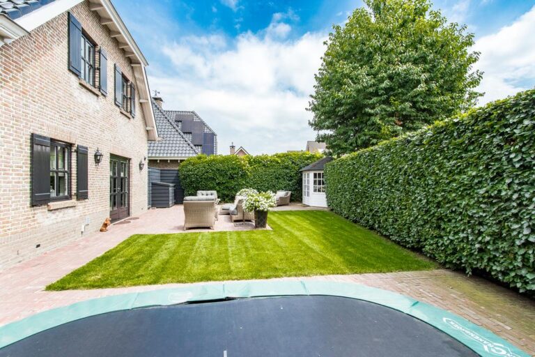 De voor- en achtertuin zijn verzorgd aangelegd met o.a. sierbestrating, gazon, diversiteit aan bomen, struiken en terrassen. De ruime oprit aan de voorzijde biedt plek voor het parkeren van meerdere voertuigen.